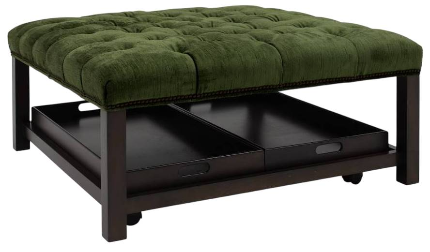 Available in round, square, oval or rectangle, the upholstered cocktail ottomans are available in a choice of more than 650 fabric options with tufted or non-tufted tops and a choice of eight finishes. An additional 15 Premier finishes – hand applied by our artisans – are also available, along with contrasting welt options and a choice of two sizes of nail-head detailing, available in four different finishes for further customization. Melding form with function, each style includes complementary solid wood serving trays for use in entertaining and hidden, locking casters for easy movement. The solid wood trays are crafted to nest on the cocktail ottomans’ bottom shelf for storage when not in use. Strategically placed wooden positioning pins on the bottom shelf help to lock the trays in place.