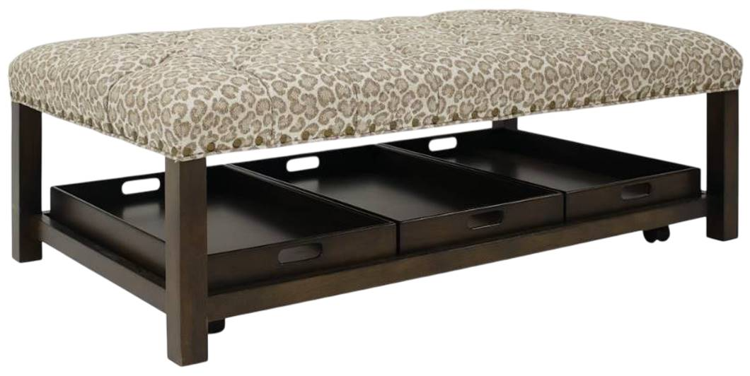 Available in round, square, oval or rectangle, the upholstered cocktail ottomans are available in a choice of more than 650 fabric options with tufted or non-tufted tops and a choice of eight finishes. An additional 15 Premier finishes – hand applied by our artisans – are also available, along with contrasting welt options and a choice of two sizes of nail-head detailing, available in four different finishes for further customization. Melding form with function, each style includes complementary solid wood serving trays for use in entertaining and hidden, locking casters for easy movement. The solid wood trays are crafted to nest on the cocktail ottomans’ bottom shelf for storage when not in use. Strategically placed wooden positioning pins on the bottom shelf help to lock the trays in place.
