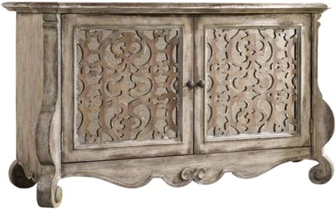 Set a buffet of livable luxury. The timeless Chatelet buffet features two mirrored fretwork doors, a scalloped base and the soft amber caramel froth finish. The accent finish is paris vintage, a distressed white with fretwork overlay.Read More