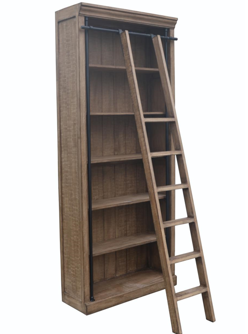 Its antique natural finish and attached ladder provide both style and practicality, offering easy access to high shelves and a unique focal point for any room