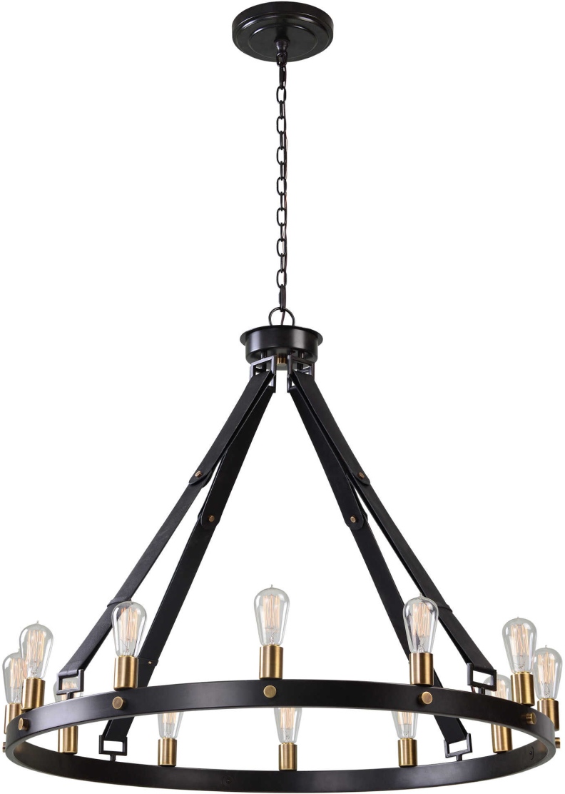 Combination of dark antique bronze and weathered bronze with leather straps featuring a large circle body and 8" oversized canopy. 12-60 watt max Edison sockets. Bulbs not included. Supplied with 20' wire and 7' chain for adjustable installation.Read More