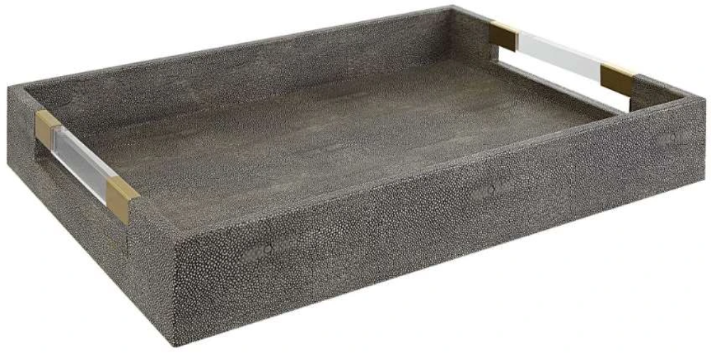 The Wessex tray is covered in elegant gray faux shagreen with clear acrylic handles and aged gold accents. Make a bold statement by incorporating this stunning home decor into your home.Read More